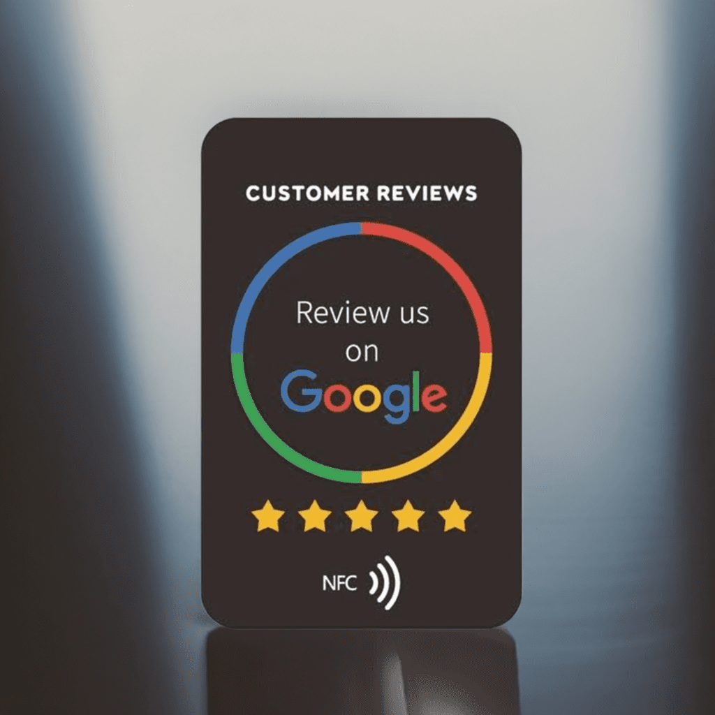Introducing our  NFC Tap Cards for Google reviews in sleek black, designed for seamless data transfer and contactless communication. Each card is equipped with advanced NFC technology, ensuring secure and efficient connectivity with compatible devices. Ideal for business professionals, event organizers, or anyone seeking a modern solution for sharing information effortlessly, these cards combine functionality with a sophisticated aesthetic.